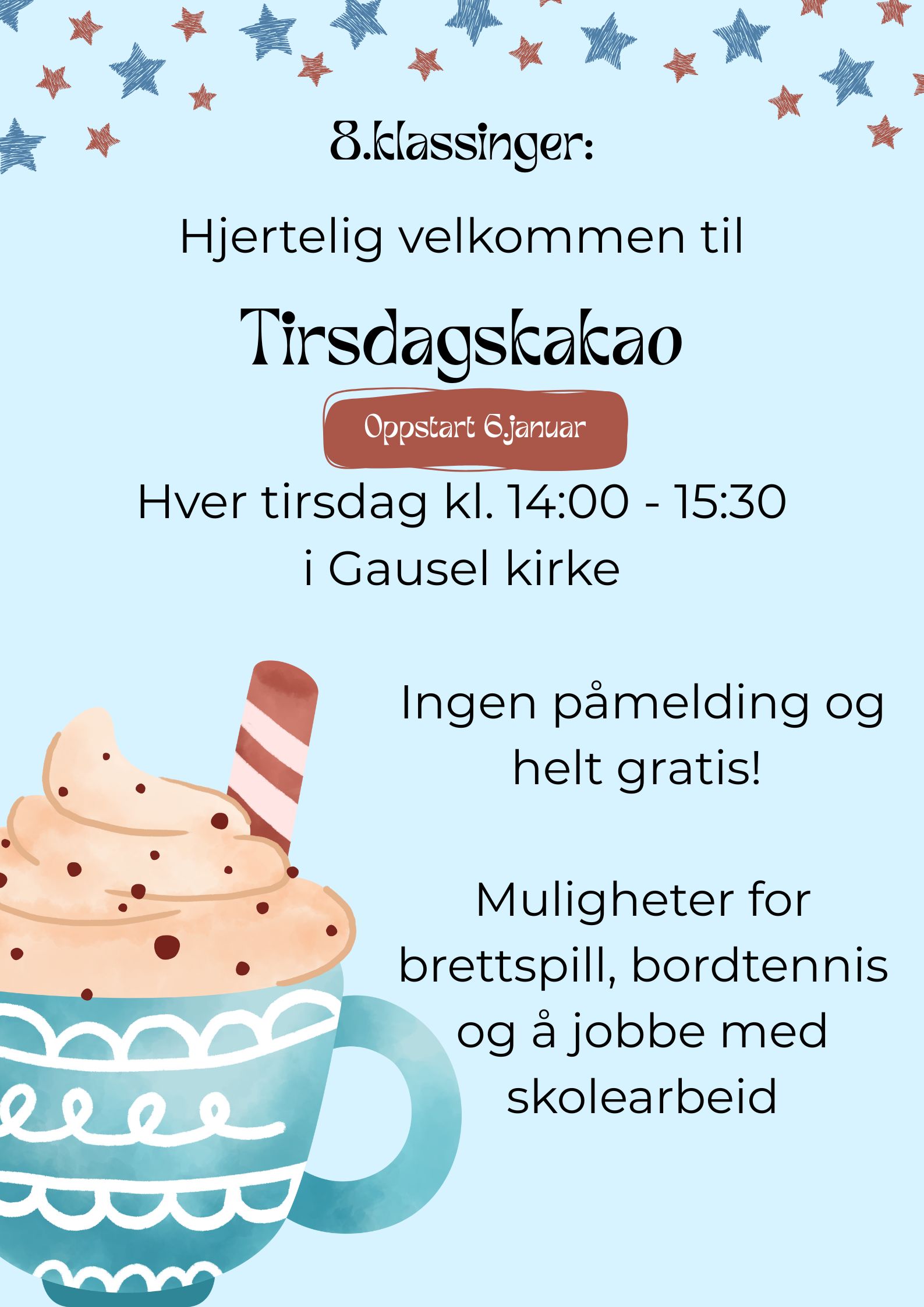 Tirsdagskakao i kirken for alle 8. klassinger hver tirsdag